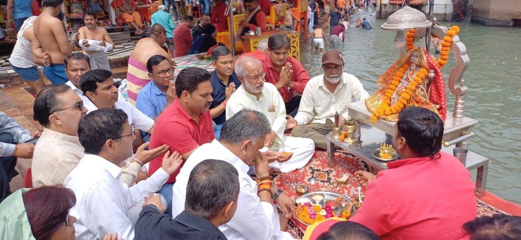 हरिद्वार। बुधवार को प्रेस क्लब (रजि.) हरिद्वार के नवनिर्वाचित पदाधिकारियों ने हरकी पैड़ी पहुंचकर गंगा पूजन कर आशीर्वाद लिया। इस अवसर पर नवनिर्वाचित प्रेस क्लब अध्यक्ष अमित शर्मा ने कहा कि नई कार्यकारिणी सभी पत्रकारों के हित के लिए कार्य करेगी। पत्रकारों की आवाज को शासन तक पहुंचाया जाएगा। उन्होंने कहा कि चुनाव बहुत सौहार्द्रपूर्ण वातावरण में संपन्न हुआ। जिसके लिए सभी सदस्यों का आभार जताया जाता है। महासचिव डॉ. प्रदीप जोशी ने कहा कि जिस एजेंडे के साथ चुनाव लडा गया था उसी का पालन किया जाएगा। प्रेस क्लब और पत्रकारों की समस्याओं को दूर करने के लिए नई कार्यकारिणी प्रतिबद्ध है। इस अवसर पर संजय रावल, सुनील पाल, जोगेंद्र मावी, राहुल वर्मा, अमित गुप्ता, डॉ. रूपेश शर्मा, प्रतिभा वर्मा, गोपाल कृष्ण पटुवर, बालकृष्ण शास्त्री, सुनील दत्त पांडे, संजय आर्य, डॉ. शिवा अग्रवाल, धर्मेंद्र चौधरी, लव कुमार शर्मा, कुमकुम शर्मा, अविक्षित रमन, गंगा सभा अध्यक्ष नितिन गौतम आदि उपस्थित थे।
