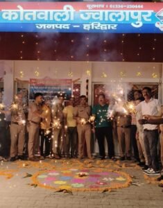 हरिद्वार। ज्वालापुर कोतवाली के पुलिस अधिकारियों और कर्मचारियों ने कोतवाली परिसर में अपने अंदाज में दीपावली का जश्न मनाया। पुलिसकर्मियों ने पटाखे, फुलझड़ियां और अनार जलाकर तथा एक-दूसरे को मिठाई खिलाकर दीपावली की बधाइयां दीं।
