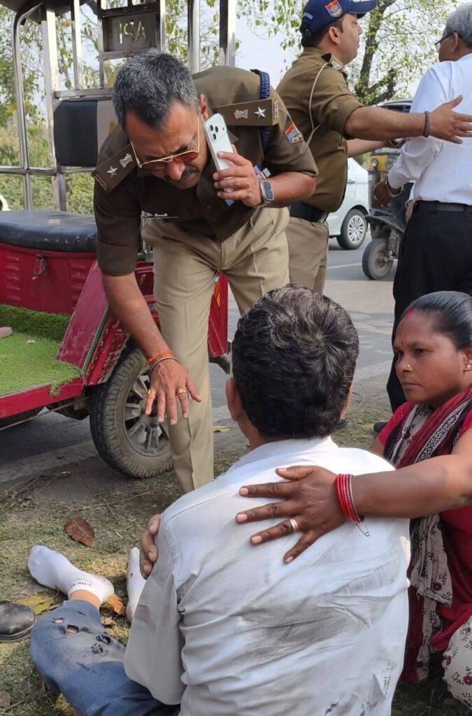 हरिद्वार। भेल में हुई सड़क दुर्घटना में दो लोग घायल हो गए। पुलिस ब्रीफिंग में जा रहे एसएसपी नवनीत सिंह ने सड़क पर घायलों को देखकर 108 एंबुलेंस को बुलवाकर मातहतों के साथ दोनों को मेला अस्पताल भिजवाया। घटना भेल फाउंड्री गेट के बीच की है। बकरी के साथ सड़क पार कर रहे एक व्यक्ति को बचाने के चक्कर में बाइक सवार ऑटो से टकरा गया। जिस वजह से बाइक सवार और बकरी के साथ सड़क पार कर रहा व्यक्ति दोनों घायल हो गए। इस दौरान वीवीआईपी ड्यूटी की व्यवस्थाओं की जांच करने एवं डी-ब्रीफिंग के लिए जा रहे एसएसपी नवनीत सिंह ने बीच सड़क पर घायलों को पड़े देख अपना गाड़ी रूकवायी और मानवता की मिसाल पेश करते हुए 108 को मौके पर बुलाकर पुलिसकर्मियों के साथ दोनों को मेला अस्पताल भेजा। पुलिस के सूचना देने पर बाइक सवार के परिजन भी मेला अस्पताल पहुंच गए। चिकित्सकों के मुताबिक दोनों घायलों की हालत खतरे से बाहर है।